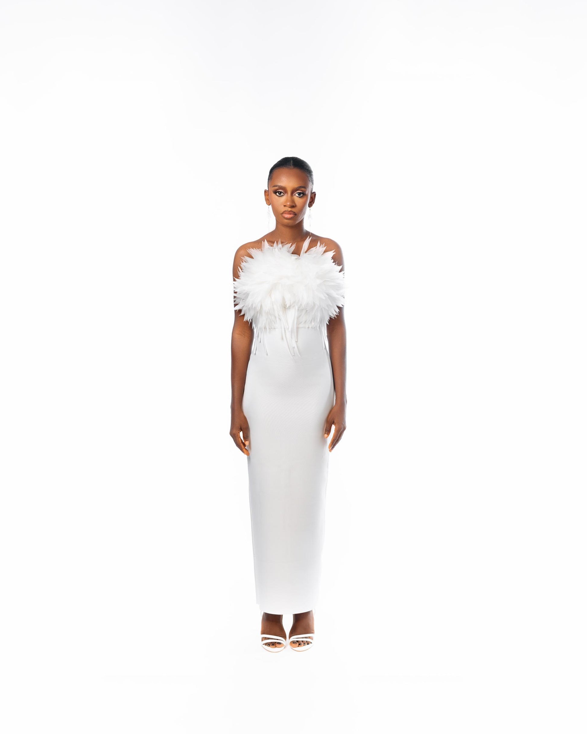 A white straight maxi dress with sleeveless design, featuring bold charming designs on the chest area, a subtle slit at the back, and a zip closure for added convenience.